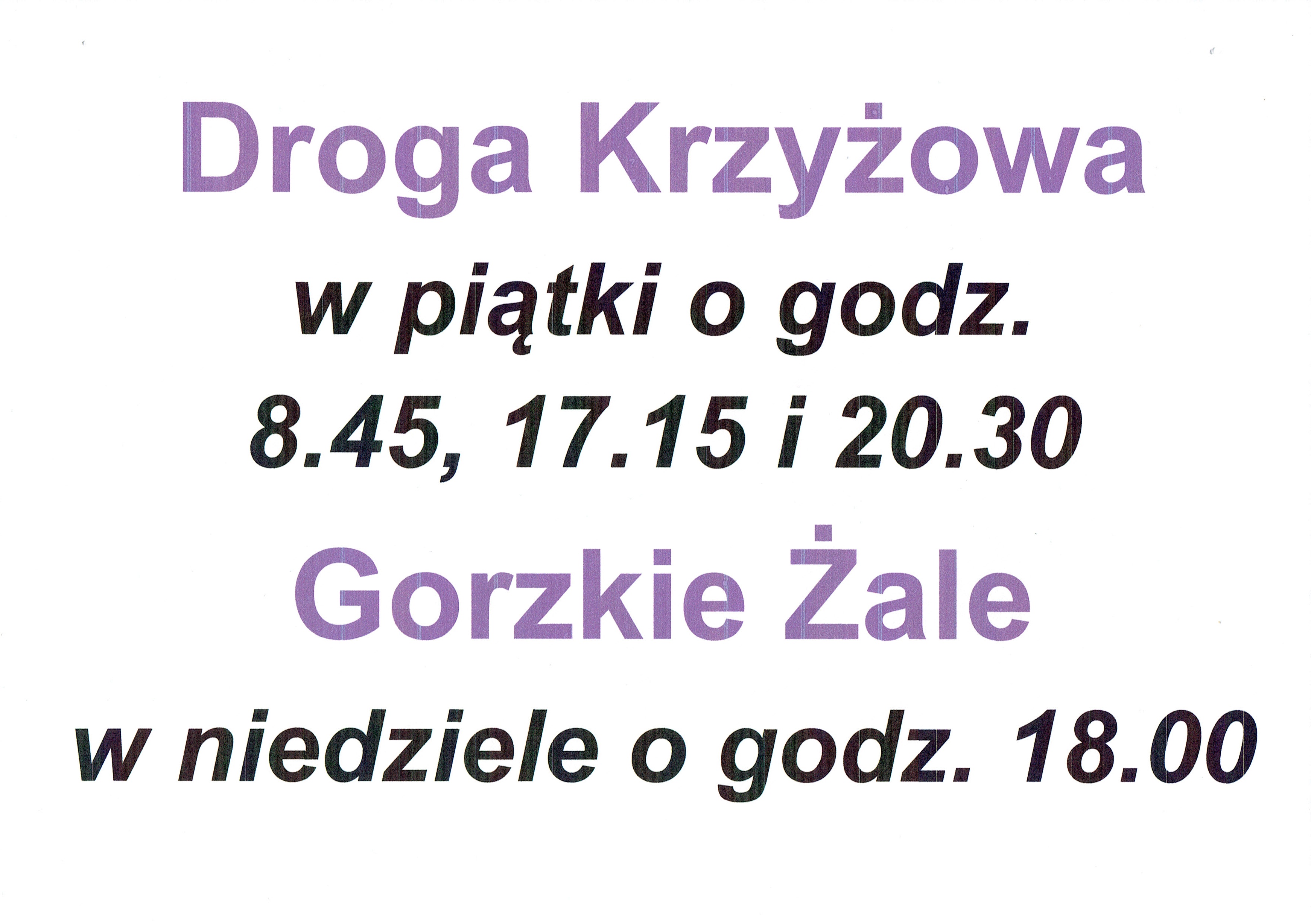 5. W niedziele Wielkiego Postu Gorzkie Żale z kazaniami pasyjnymi będą o godz. 18.00. Natomiast Drogi Krzyżowe będę w piątki o godz. 8.45, 17.15 i - z udziałem kleryków – o godz. 20.30.