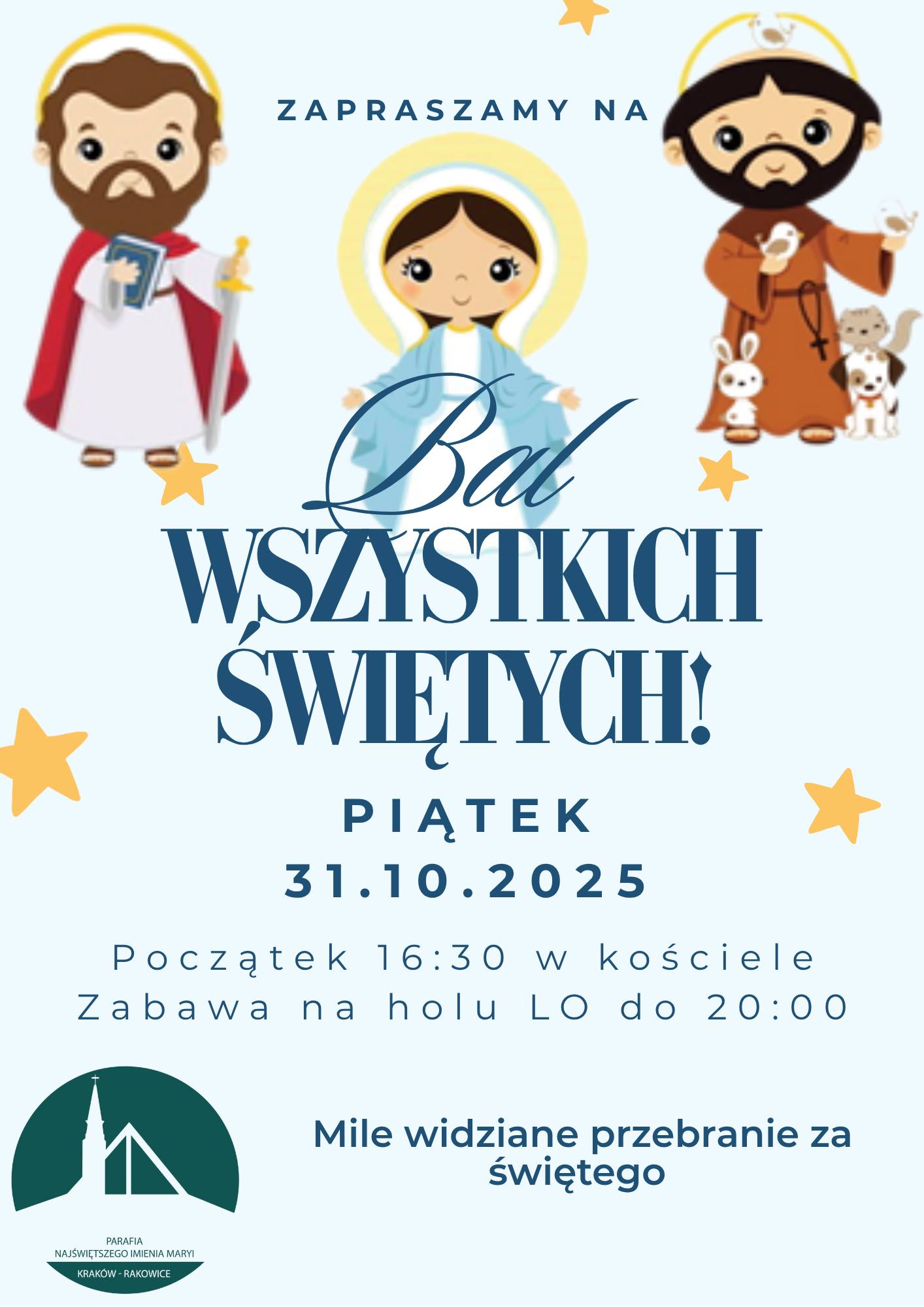 Zapraszamy wszystkie dzieci na Bal Wszystkich Świętych. Rozpoczęcie w kościele o godz. 16.30. Po krótkiej modlitwie przemarsz do liceum i tam wspólna zabawa do godz. 20.00. Zachęcamy, by dzieci przyszły przebrane za jakiegoś swojego ulubionego świętego.